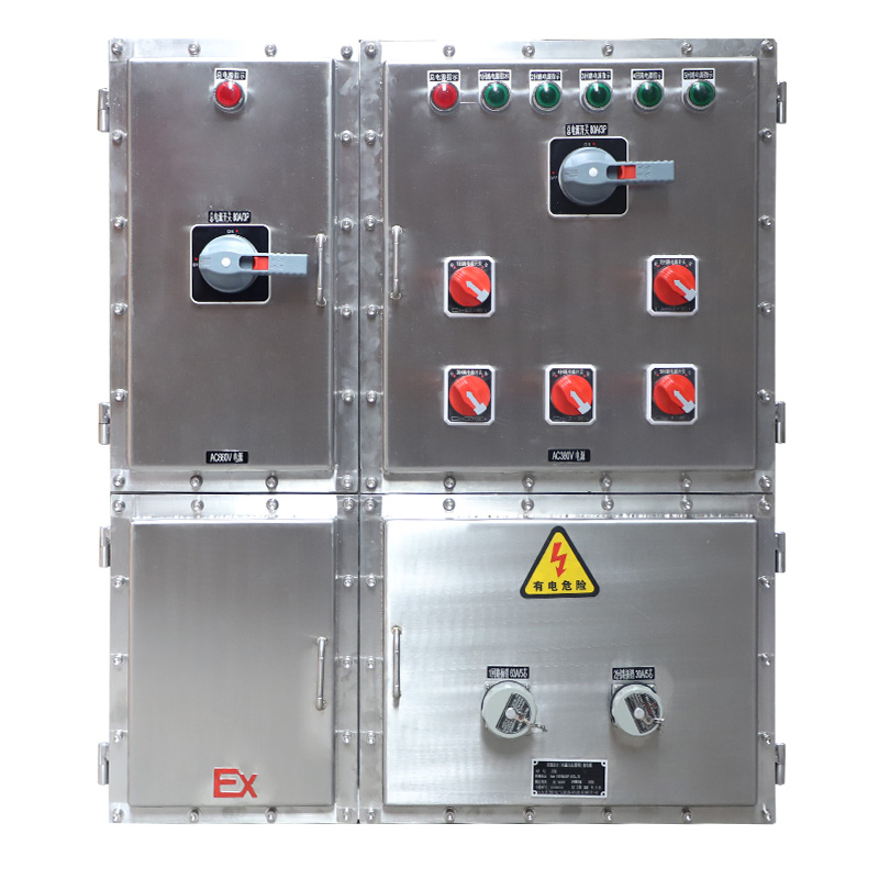 這款不銹鋼防爆防腐檢修電源箱采用304不銹鋼材質焊接而成,雙開門設計,是使用在易燃易爆區(qū)域用來對線路的檢修。 防爆防腐檢修電源箱里面主要裝的是一些斷路器,可以裝塑殼型的,也可以裝小型的。除了斷路器還可以配插座。防爆檢修電源箱一般都是有總開關跟分開關還有防爆插座這三部分電器線路組成。 總開關的作用是用來控制總的線路,分開關的作用是用來控制分路的開停。而防爆插座的作用是為了方便現(xiàn)場設備的檢修。需要檢修哪臺設備,只需要將設備的線路接到相對應的插座上面就可以。 防爆檢修電源箱的優(yōu)點在于箱體上面有可以移動拆卸的防爆插座。這樣給整個箱體的機動性提高了很多。