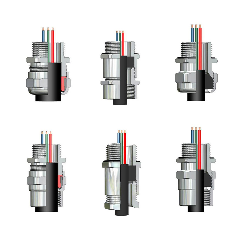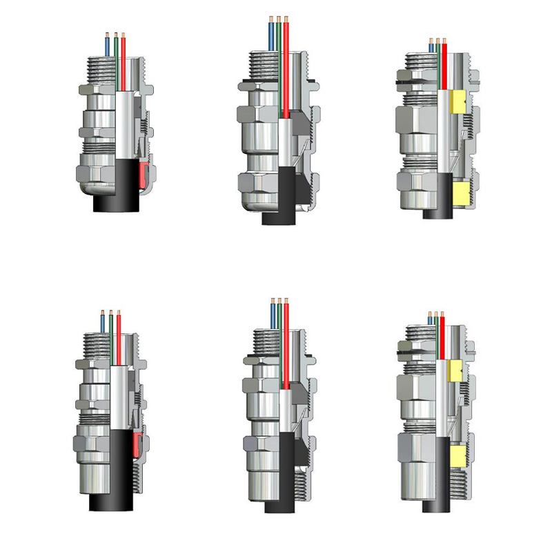 防爆格蘭頭出線口一端可將進出電纜鎖緊并起到防水防塵、防震動的作用,另一端可接入設備箱體上,也可以根據選用螺紋。接入進出口為內螺紋的電動設備上。